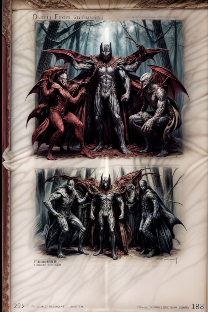 With his emotions in turmoil, Batman was then forced into a brutal confrontation with a trio of vampire gods and their seductive lover, Litheria. These dark entities – Bruthuss, the lord of chaos and violence; Vrolnakh, the mastermind of knowledge and desire; and Athubiosh, the elusive prince of cunning and plots – catalyzed a sinister metamorphosis within Batman.